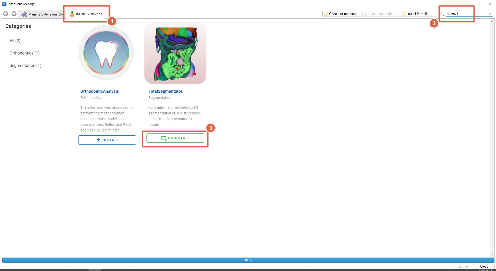 아래와 같이 install extentions 에가서 totalsegmentator를 검색하고 install 버튼을 눌러서 설치해 준다