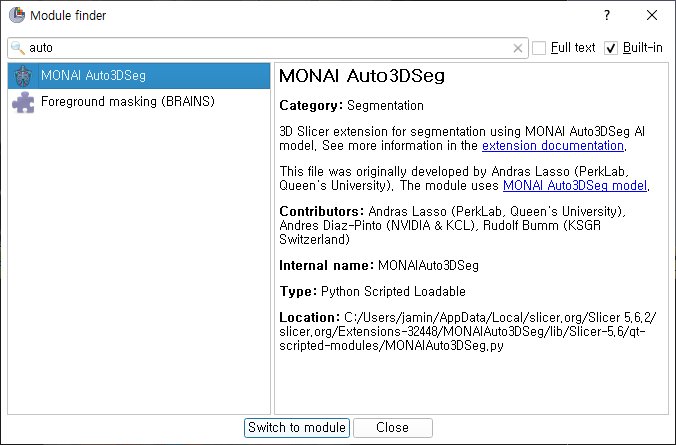 동일하게 Module Finder를 이용하여 Auto3DSeg 를 불러와 보자