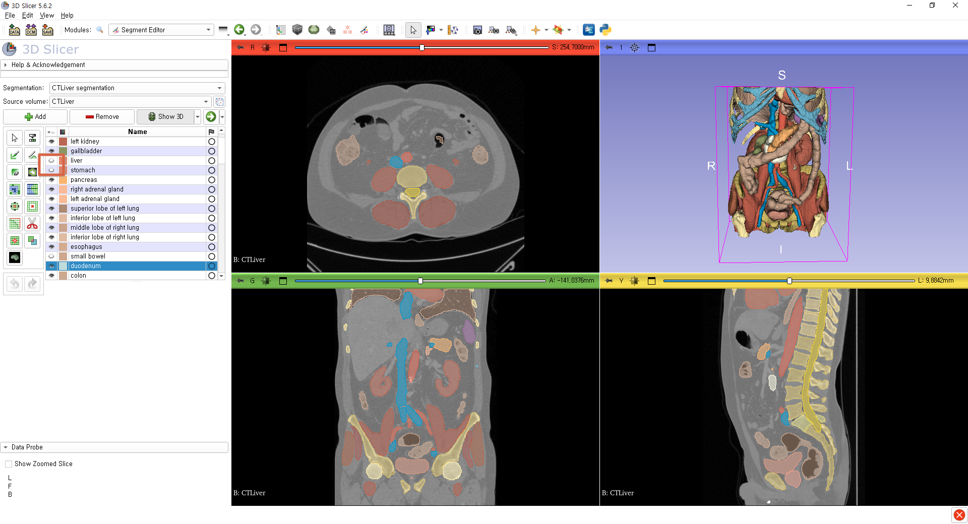동일하게 Segment Editor를 통해 화면에 나타난 장기를 visible/invisible 보이게/안 보이게 할 수 있다.