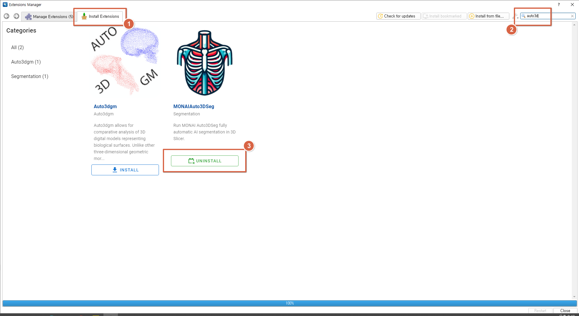 아래와 같이 install extentions 에가서 Auto3DSeg를 검색하고 install 버튼을 눌러서 설치해 준다